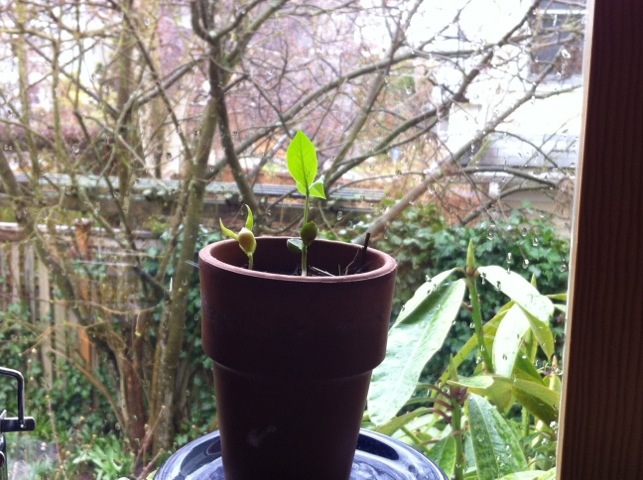 Alton found a seed that was starting to sprout within an apple and he desperately wanted to plant it. So it is sitting in a pot just adjacent to this one. It is growing, but not nearly as quickly as the Demon Seed. I doubt that we’ll have apples by the Fall. Maybe by his senior year of high school.