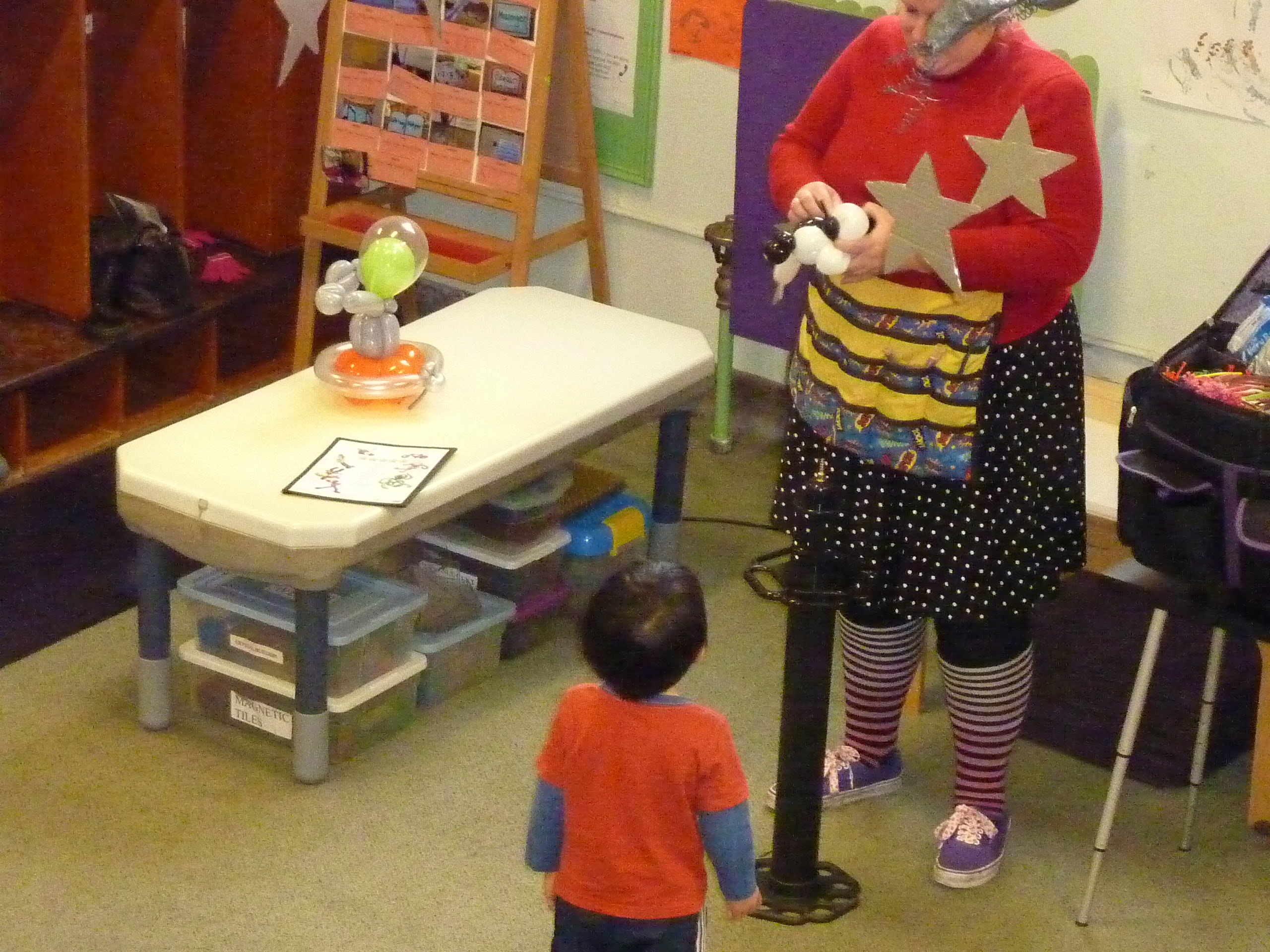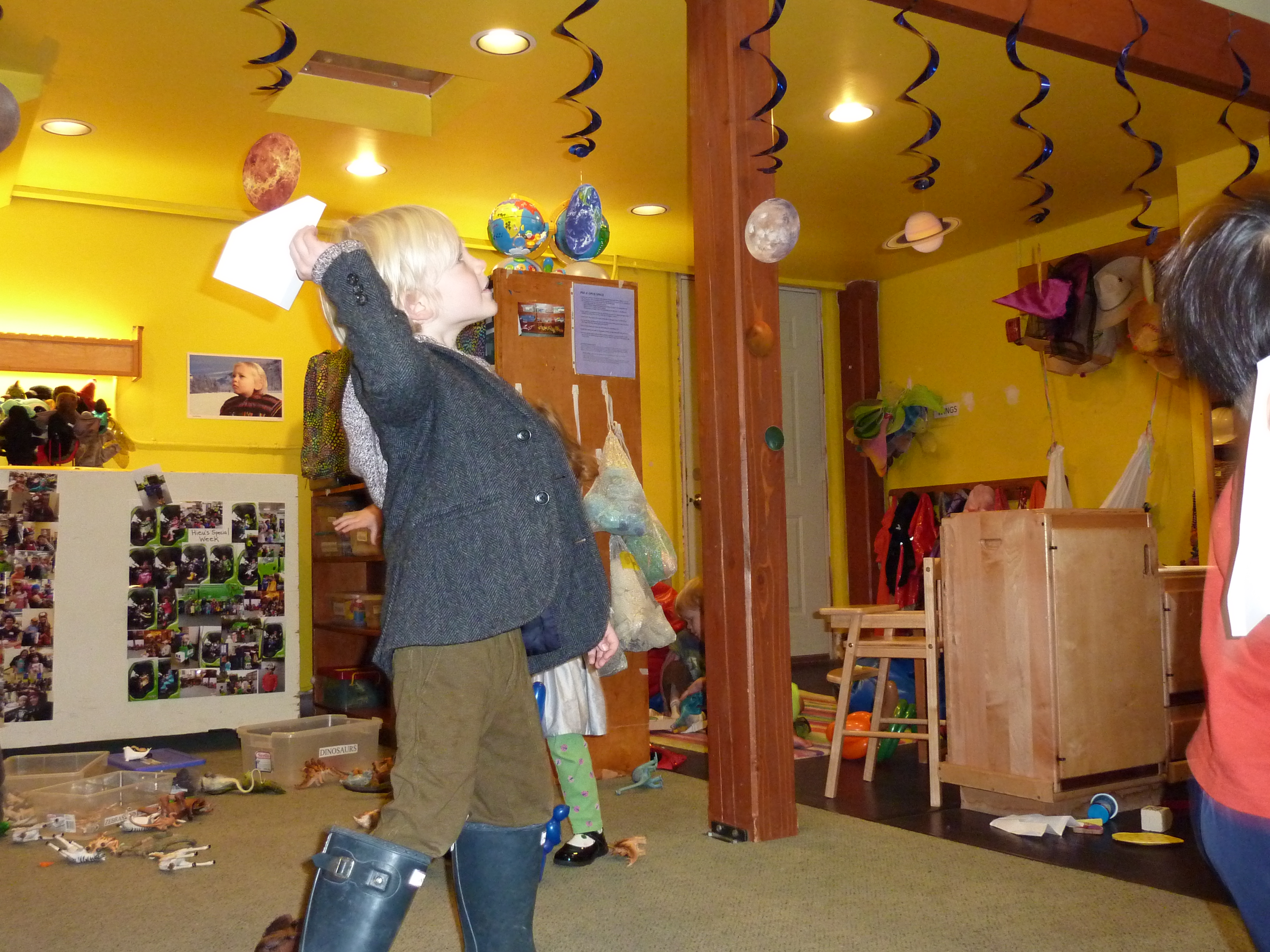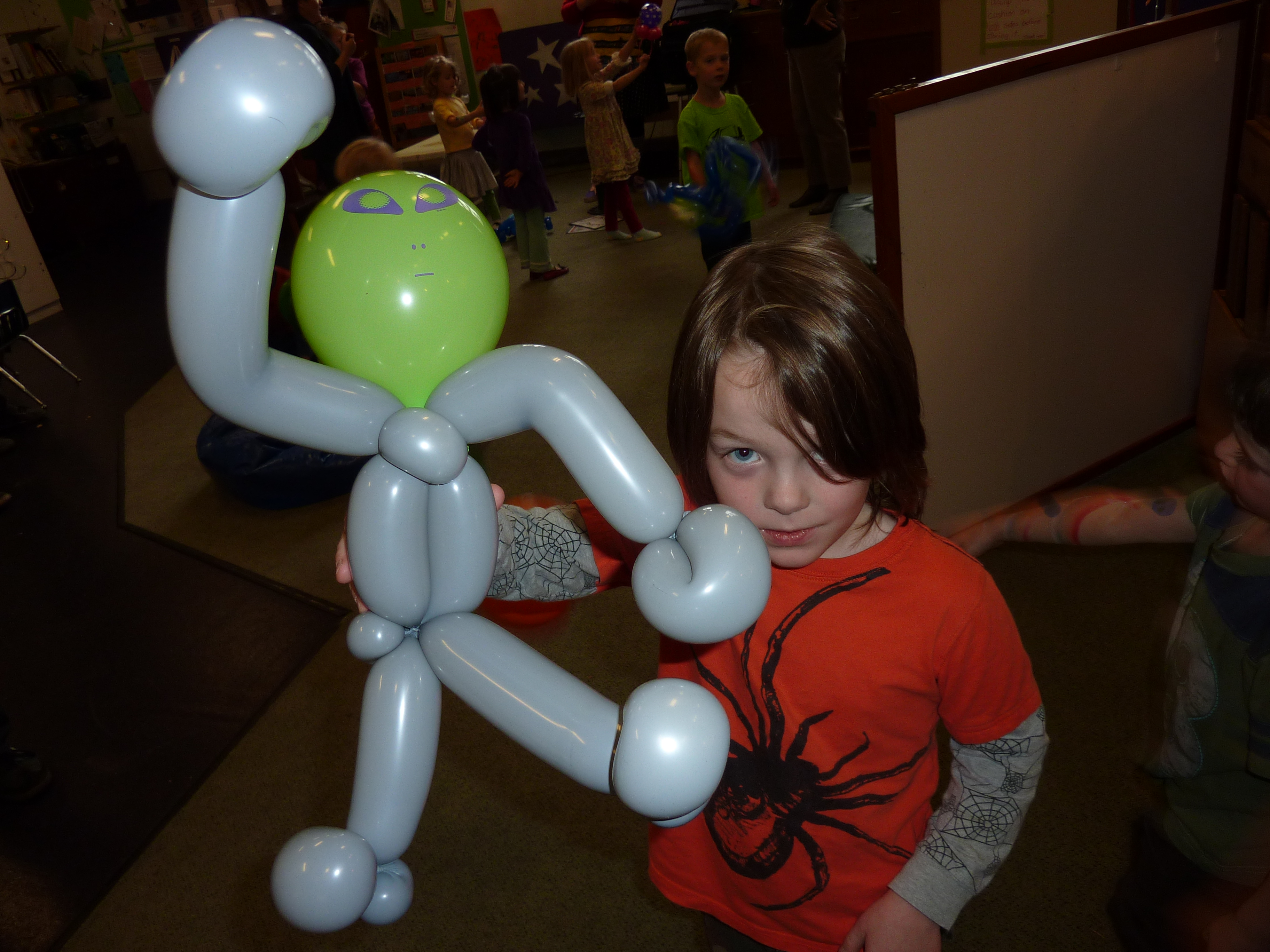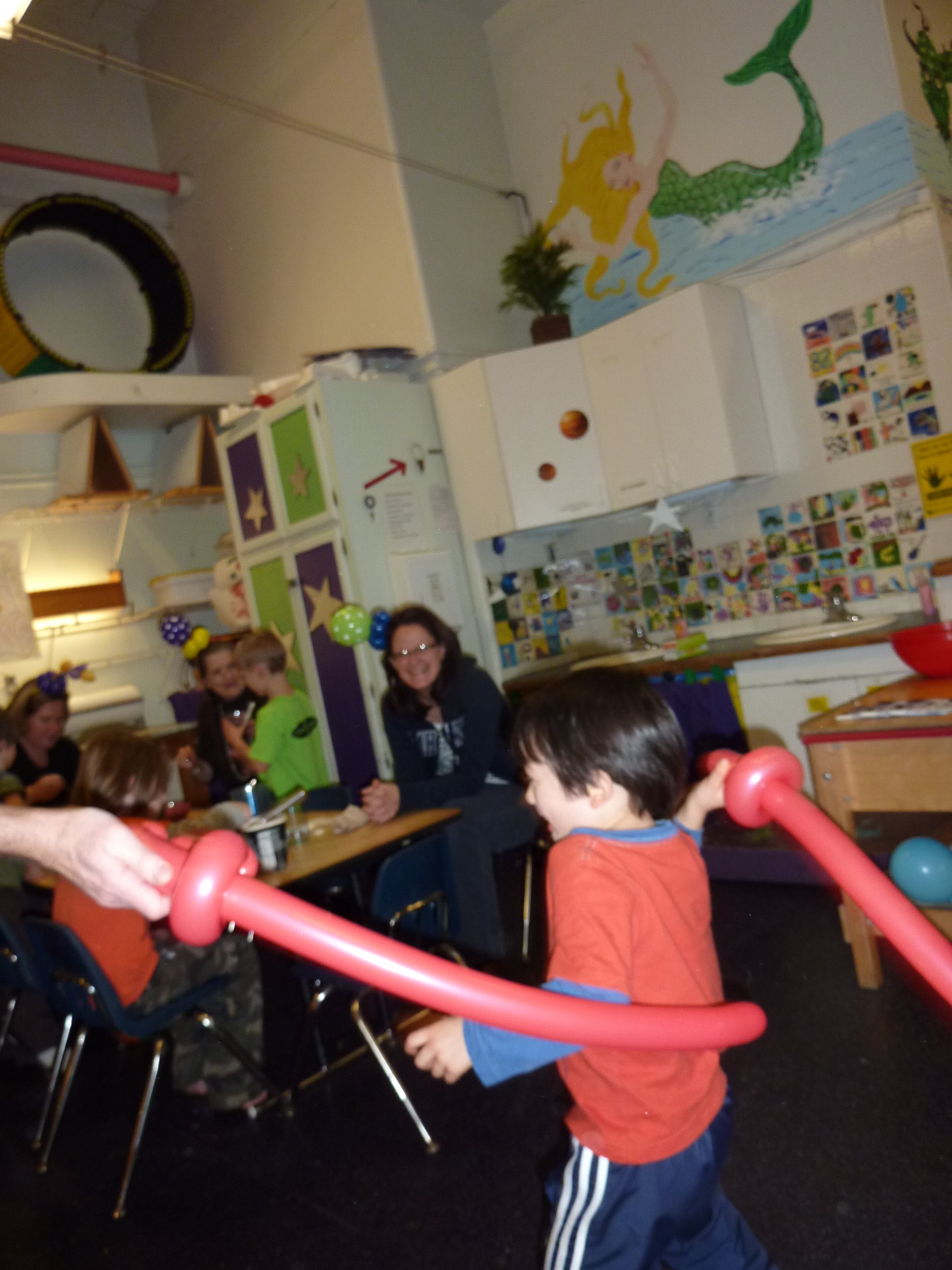 Sam (who runs the date-night at the preschool) was there for face painting, and Alton wanted a balloon person (who made some pretty amazing creations for the kids). There was a rocket art station and a paper airplane station (manned by daddy), which was a surprising hit. Some kids tried to make their own plane, or decorate one made by one of the daddies (why not the mommies?). Alton combined some of his favorite activities by launching airplanes while going down the slide. As always, he asked that people not sing “Happy Birthday” to him.