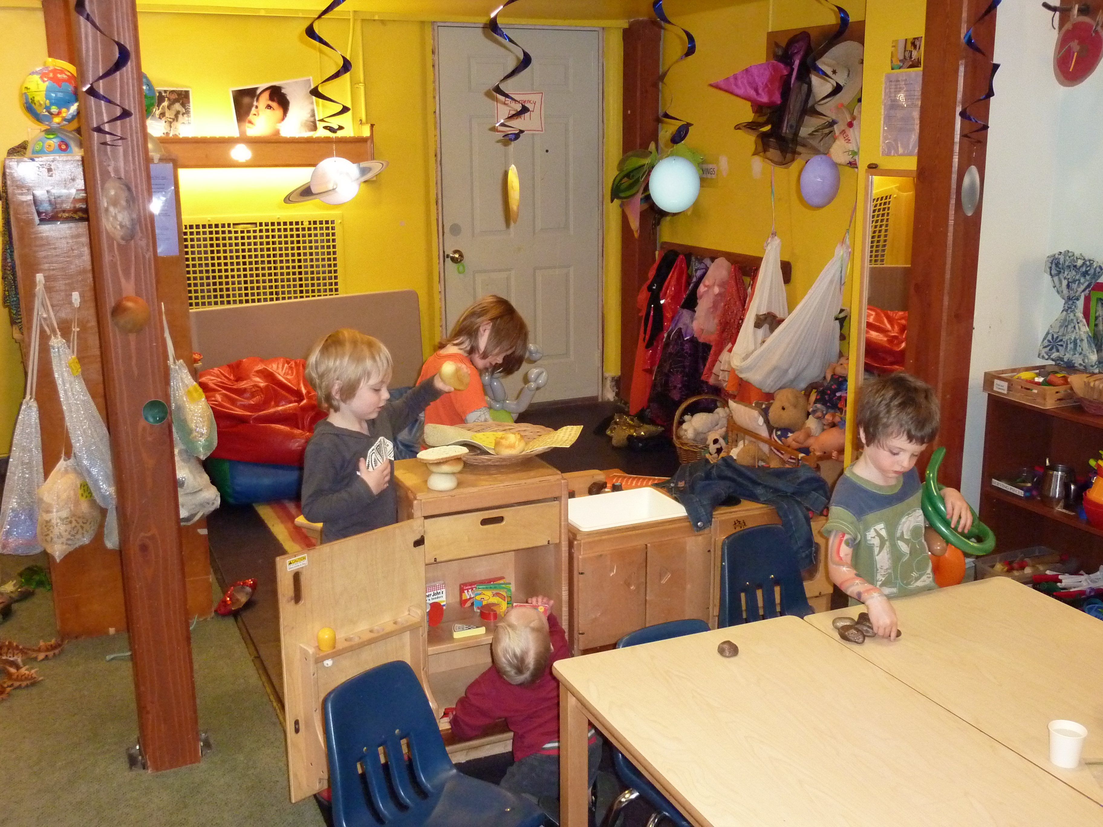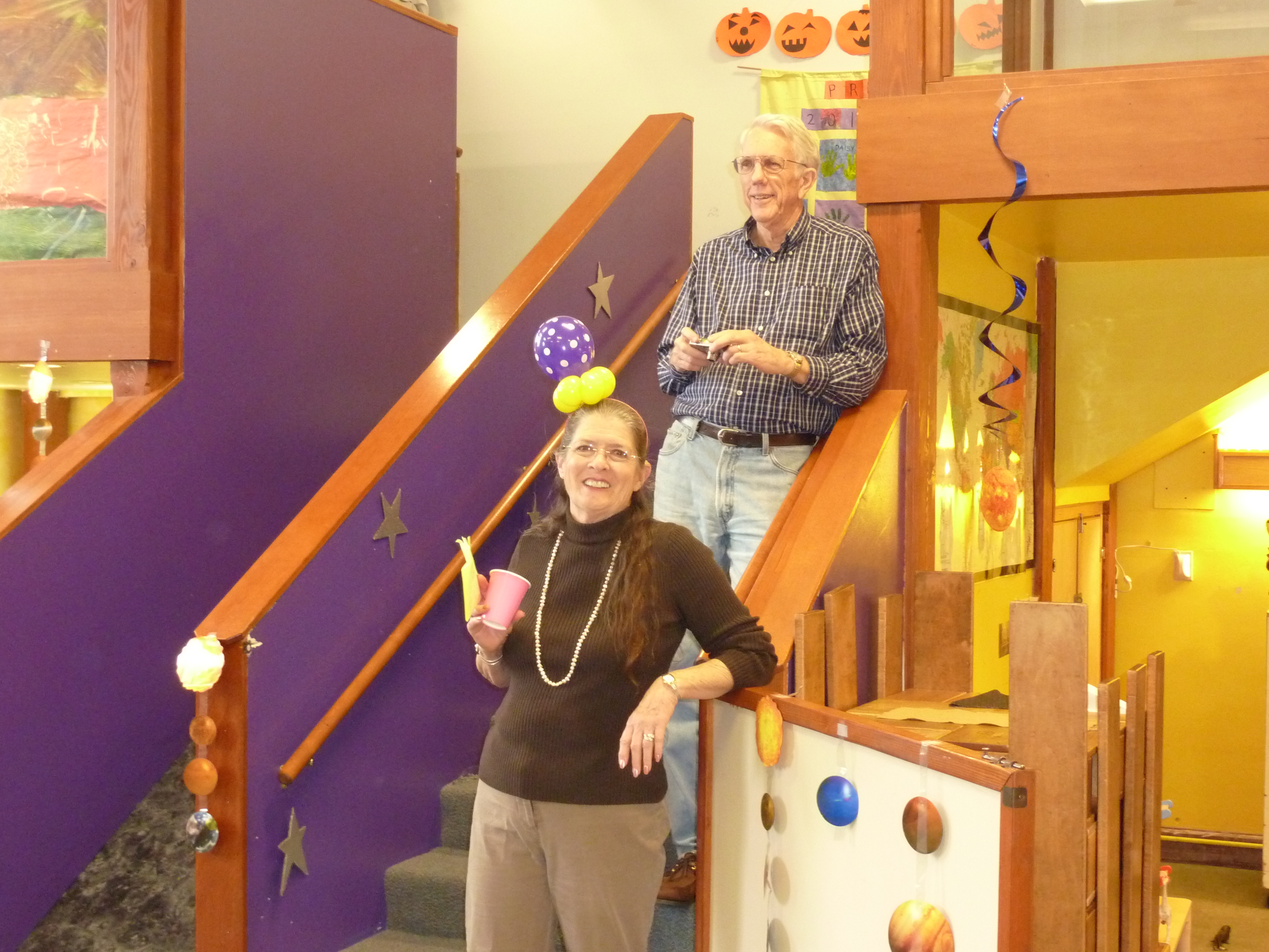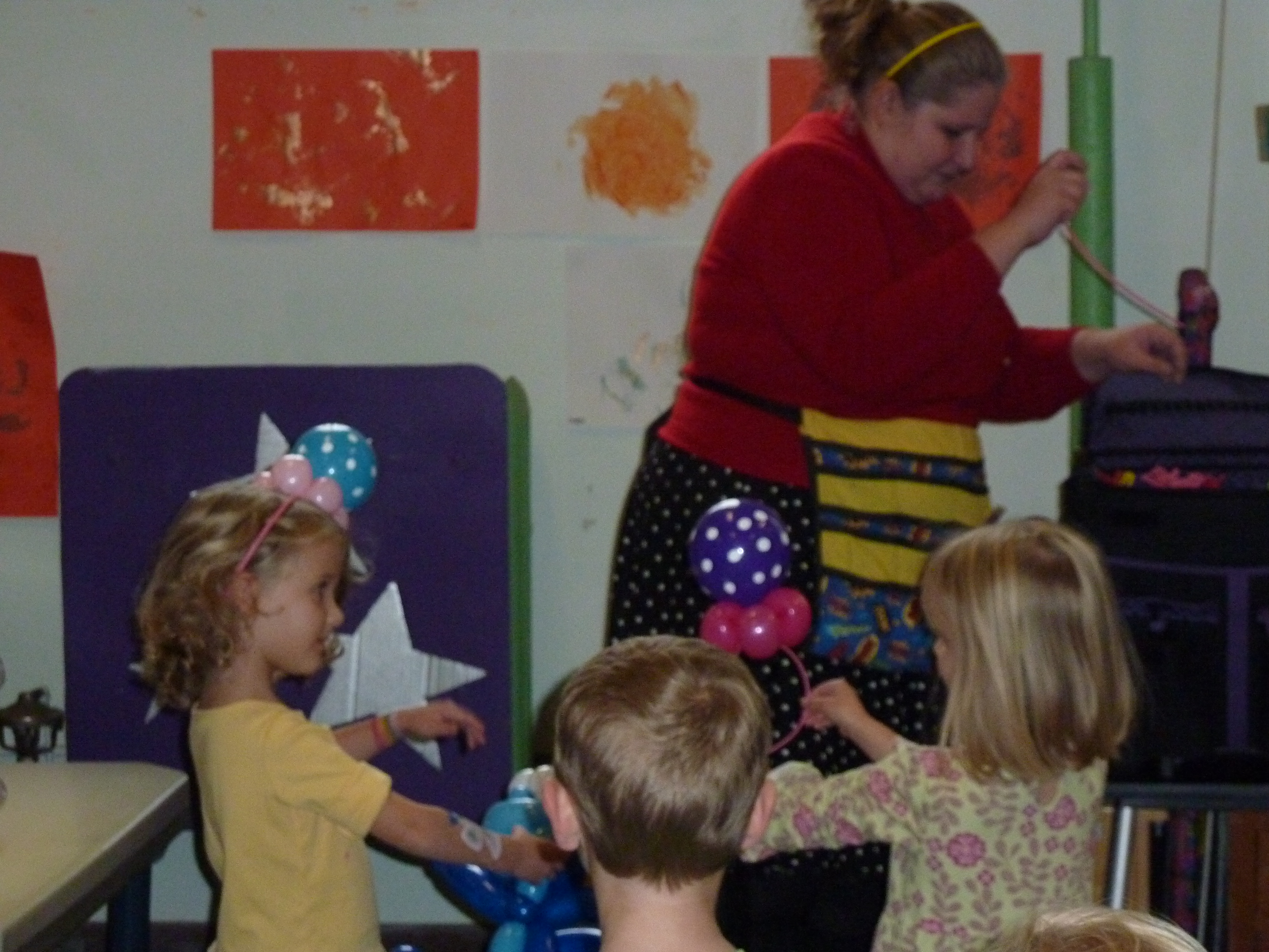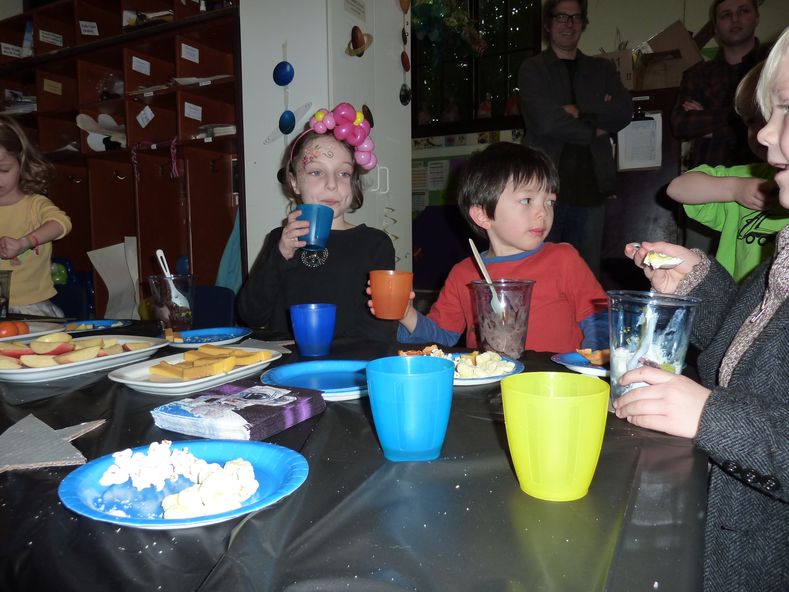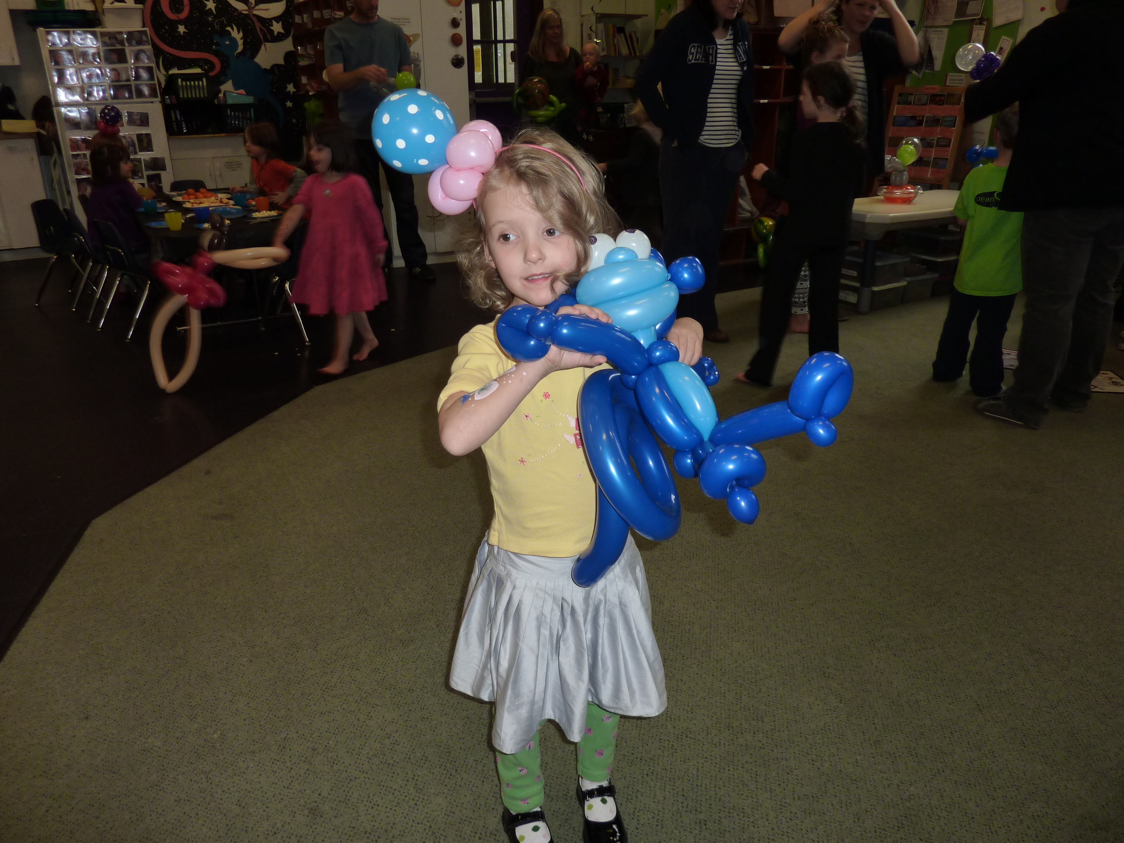 Sam (who runs the date-night at the preschool) was there for face painting, and Alton wanted a balloon person (who made some pretty amazing creations for the kids). There was a rocket art station and a paper airplane station (manned by daddy), which was a surprising hit. Some kids tried to make their own plane, or decorate one made by one of the daddies (why not the mommies?). Alton combined some of his favorite activities by launching airplanes while going down the slide. As always, he asked that people not sing “Happy Birthday” to him.