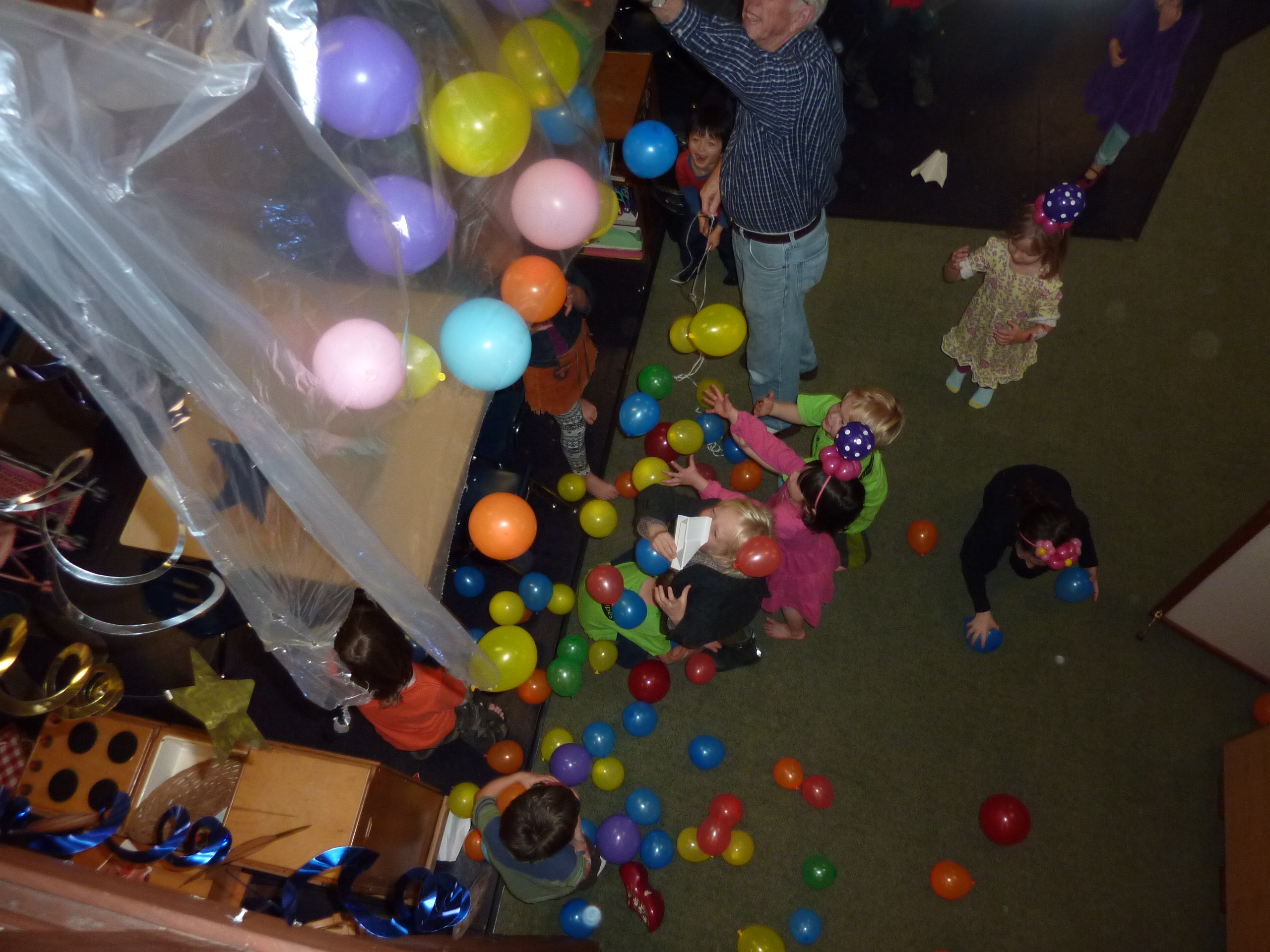 Once the kids were good and sugared up, we released the “meteor drop” of 130 balloons from a bag suspended from the ceiling. The pullstring did not work as smoothly as described on the packaging. Thankfully, gramps was tall enough that he and Alton could just reach up and shake them out (while daddy stood on the upper balcony and thwacked the bag and took pictures).