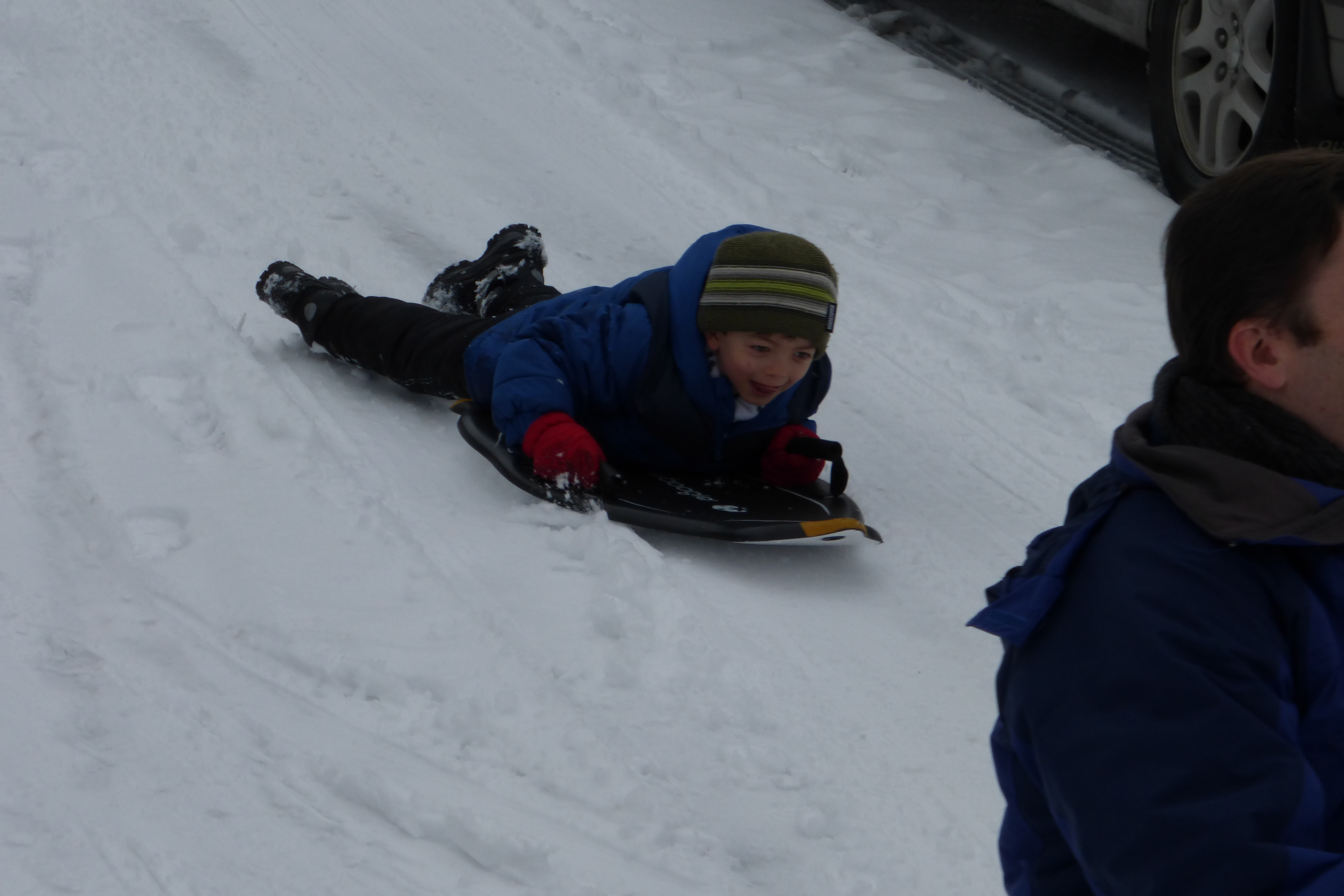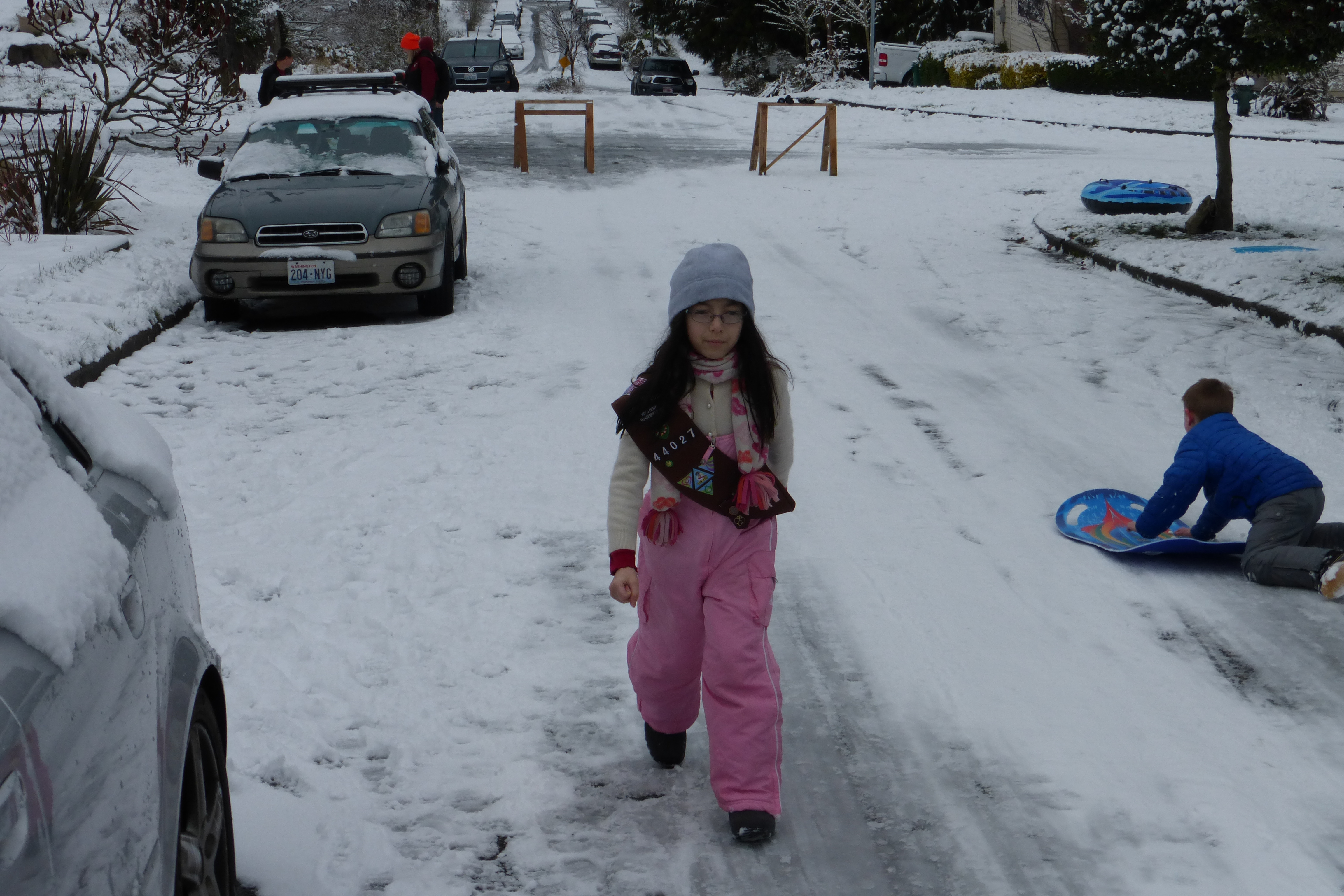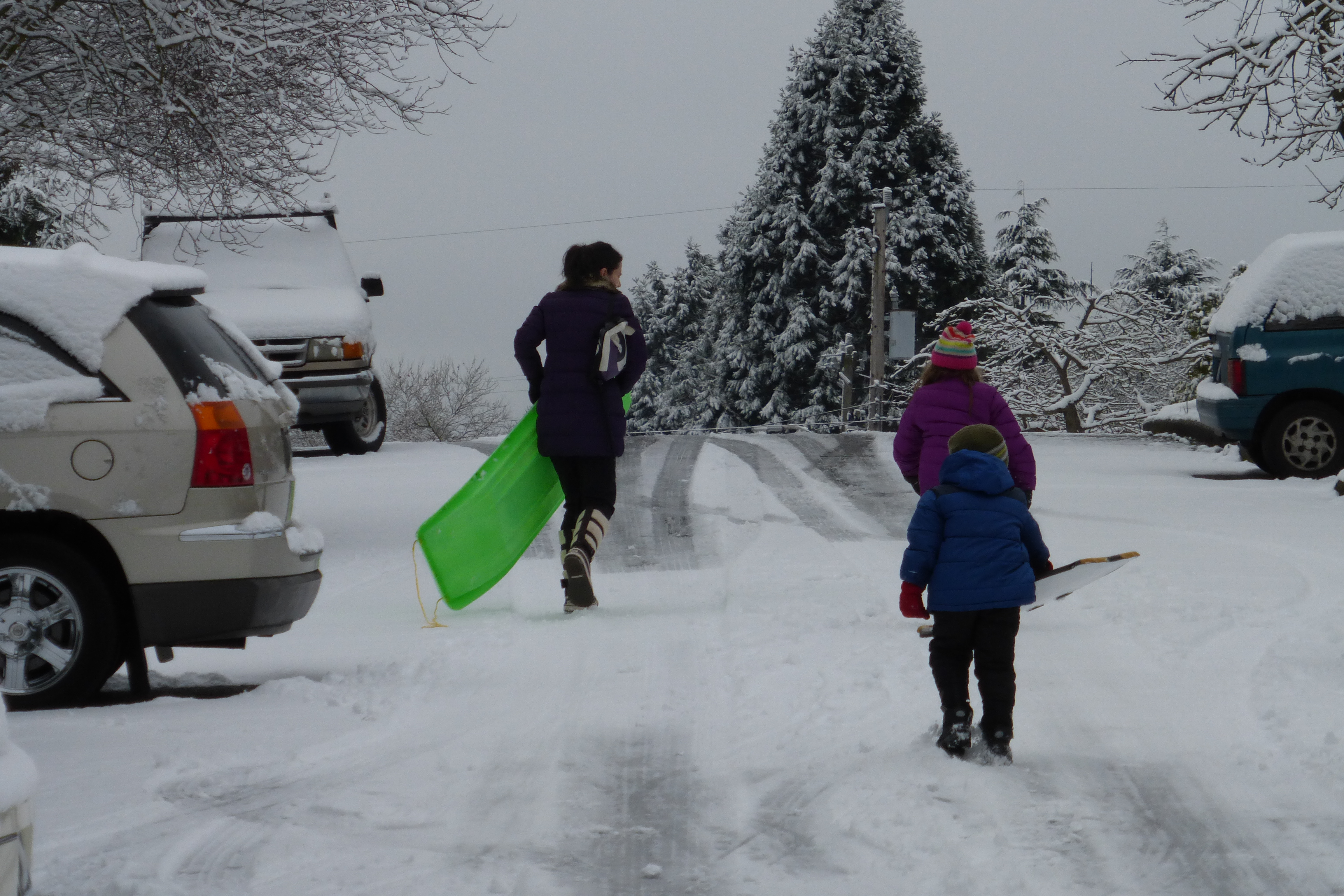 Finally got a little dusting of a couple inches of snow last night. The kids woke to a winter wonderland. With some mild bundling, we went out and the kids sledded down the sidewalk. It turns out that ours (Evanston) is the steepest street in the immediate area, so all of the neighborhood used our street for sledding. Some parents set up saw horses on the road to deter traffic and some of us made sure that the kids didn’t continue down into the more busy arterial roads.