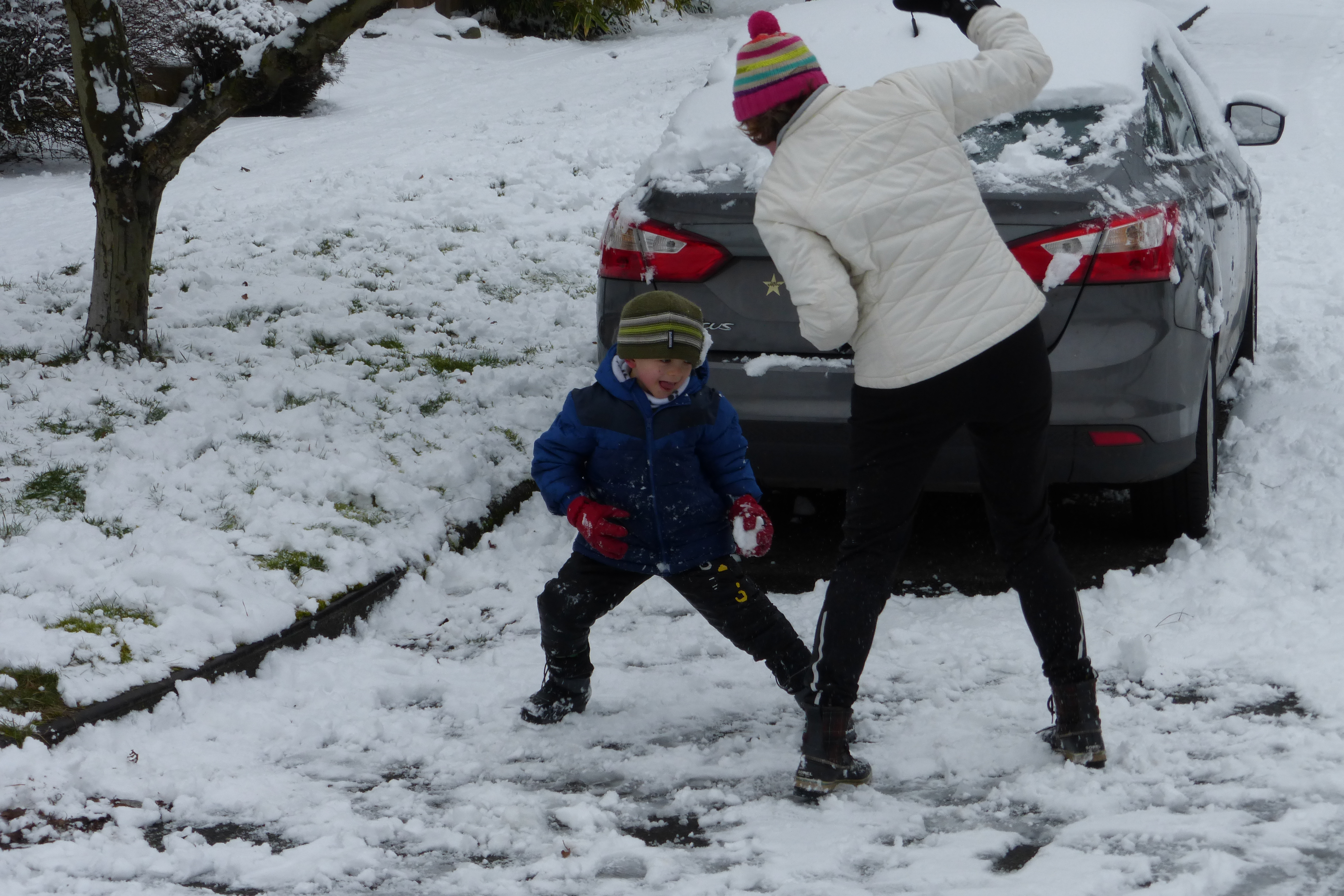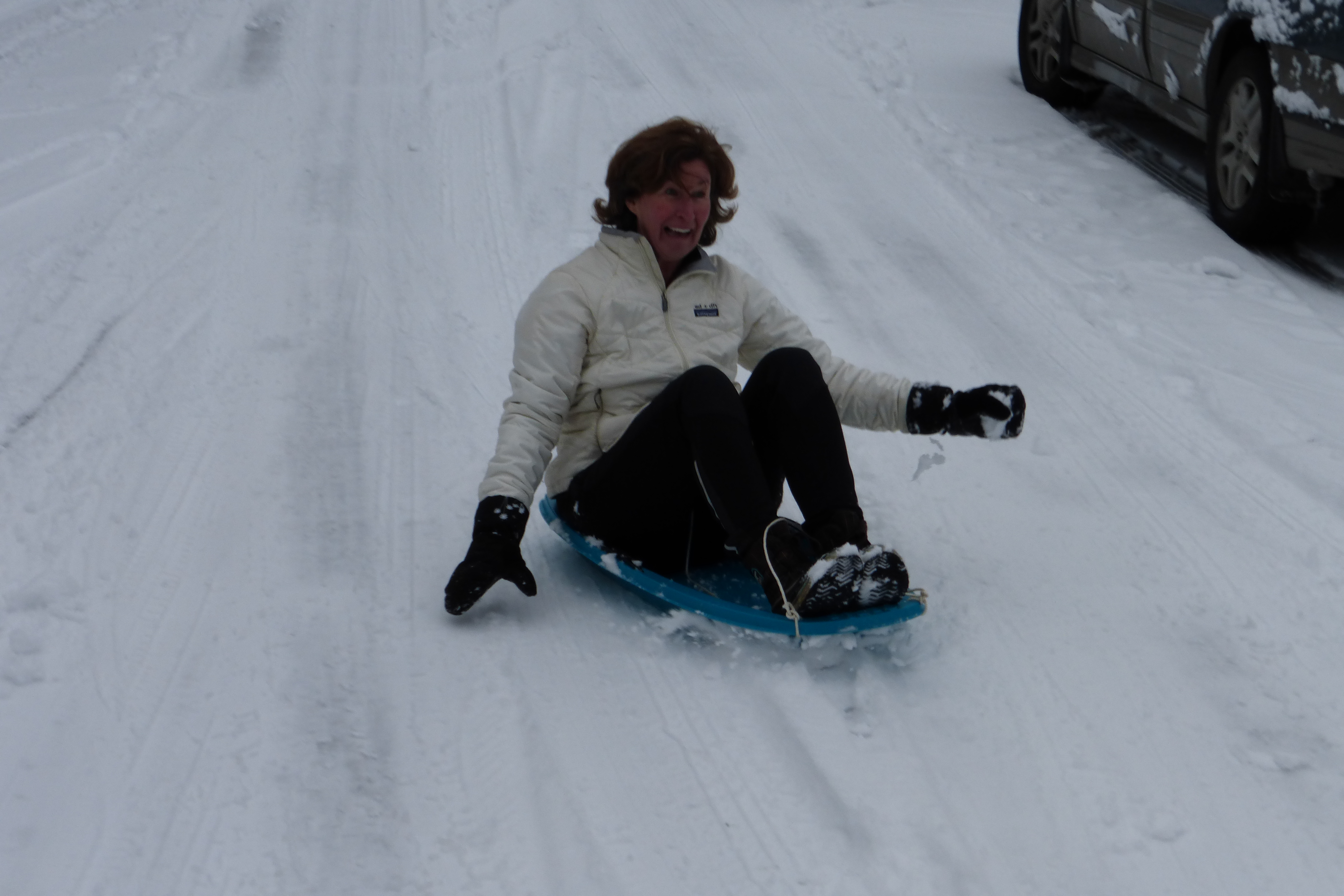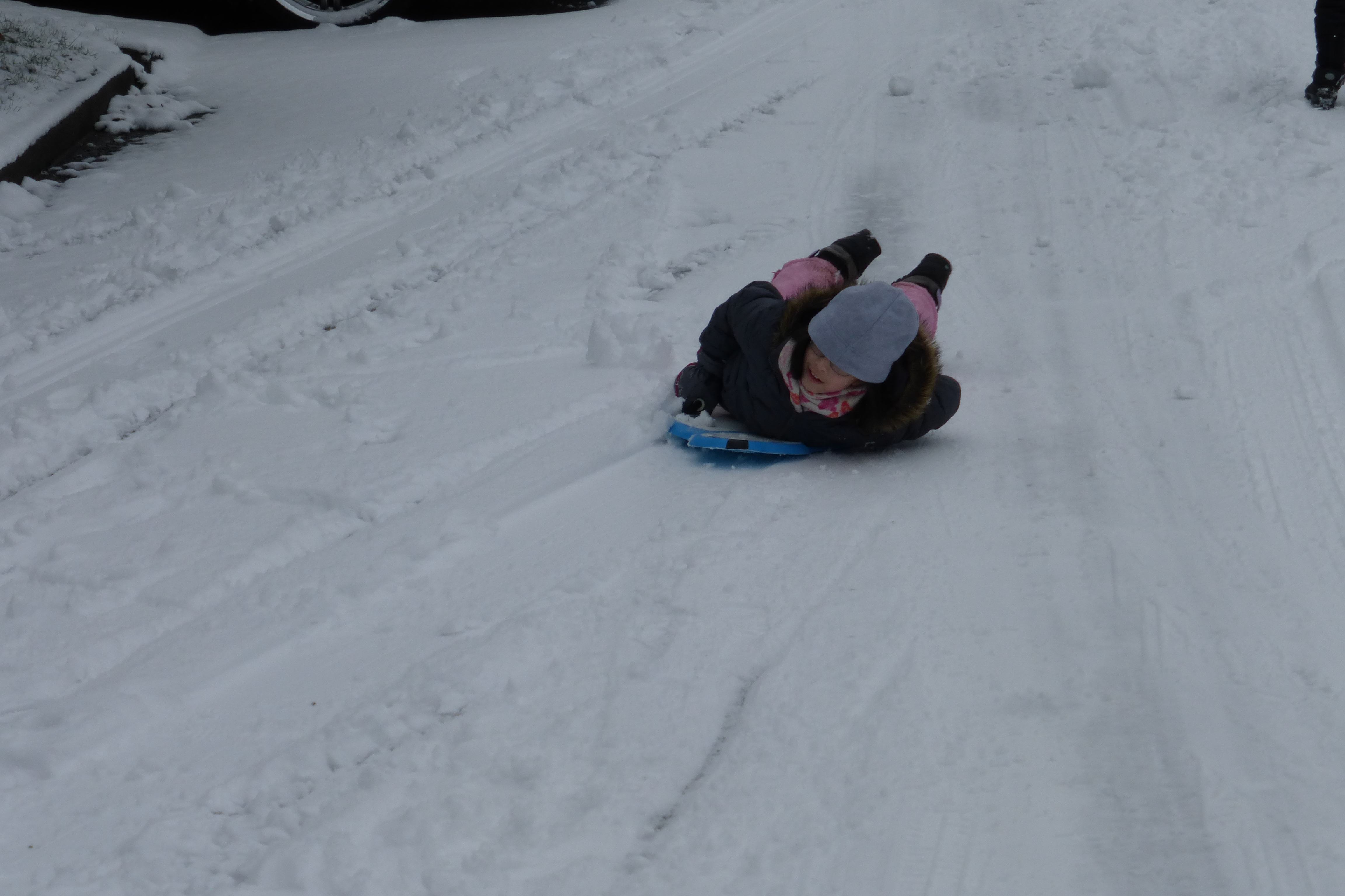 Finally got a little dusting of a couple inches of snow last night. The kids woke to a winter wonderland. With some mild bundling, we went out and the kids sledded down the sidewalk. It turns out that ours (Evanston) is the steepest street in the immediate area, so all of the neighborhood used our street for sledding. Some parents set up saw horses on the road to deter traffic and some of us made sure that the kids didn’t continue down into the more busy arterial roads.