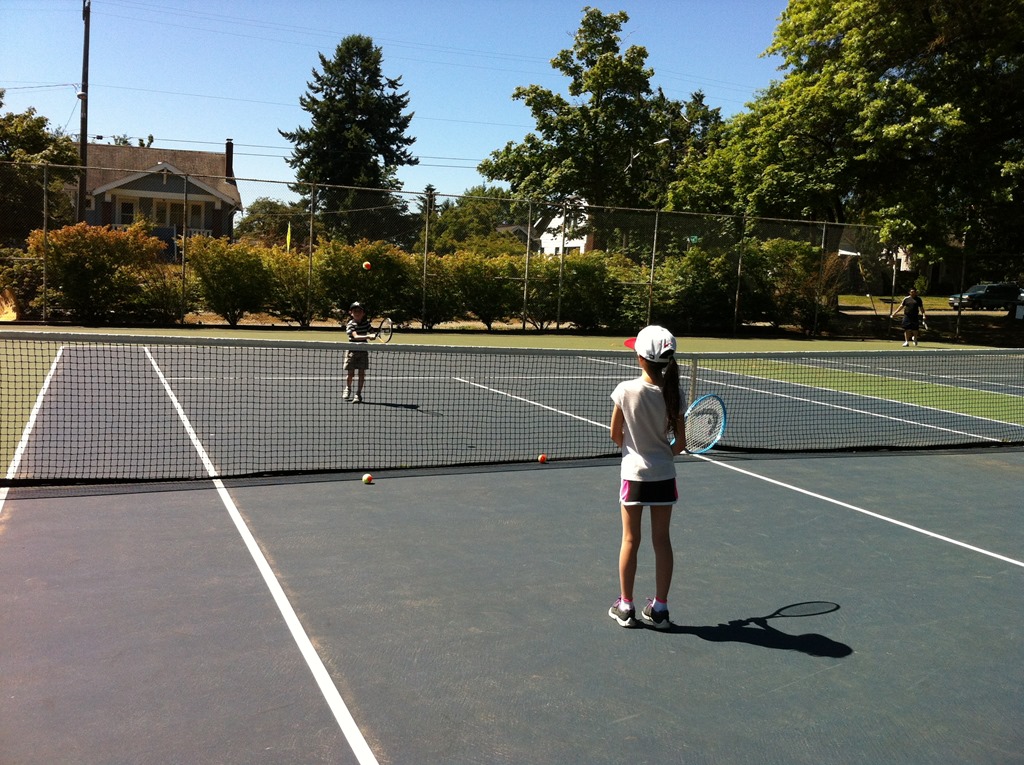 It is great that they have wanted to play tennis every evening when I come home from work (sometimes fairly late), although this often entails a lot of driving around trying to find an open court. There are nice courts in the middle of Woodland Park and on the south edge of the park. The far side of Greenlake. Also, Ballard High has good courts. There are probably many others that I have not mentioned. When their skills increase to the point that we aren’t hitting balls into the adjacent courts all of the time, we may try playing at the indoor courts at Magnusson Park. Apparently, you can reserve court times online.