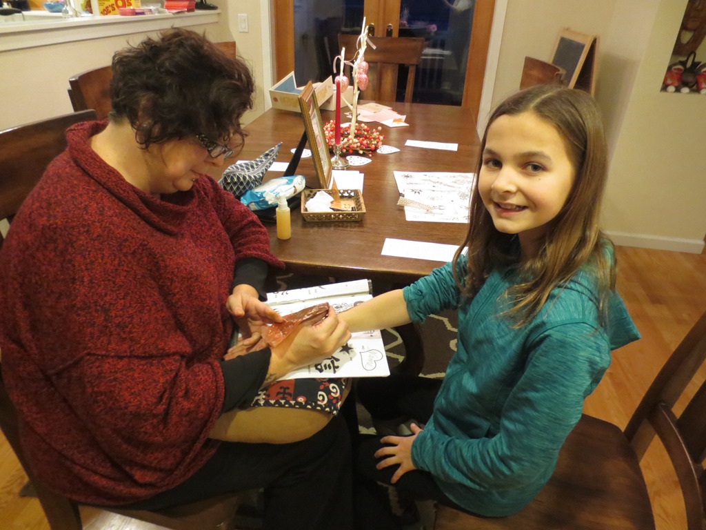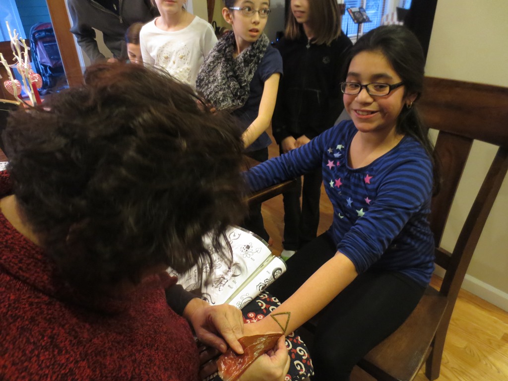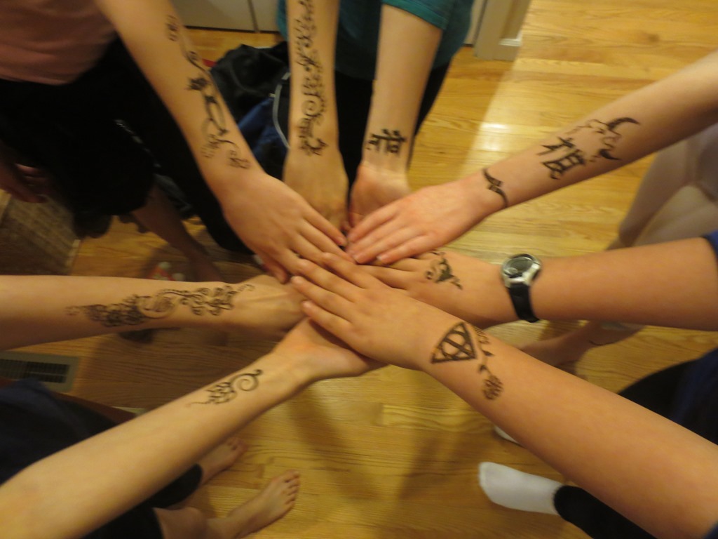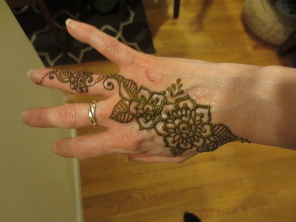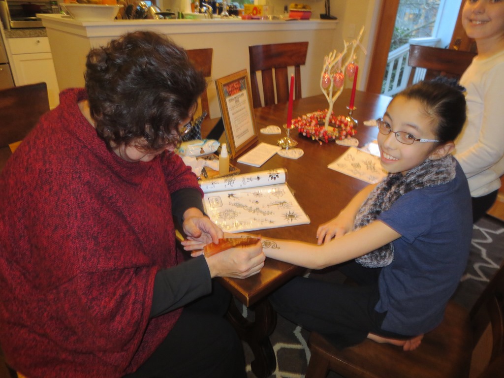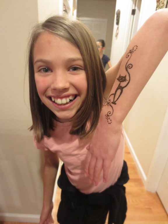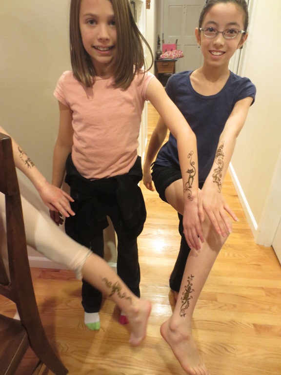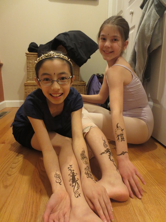 This weekend Nikola had a small birthday gathering with a few friends. Shaynee hired a woman who does mehndi henna decorations to tattoo designs on their hands, arms, and legs. Even the moms who stayed (Susan and Shaynee) got henna inked too! As a parting gift, each girl went home with a sock monkey with a red envelope.