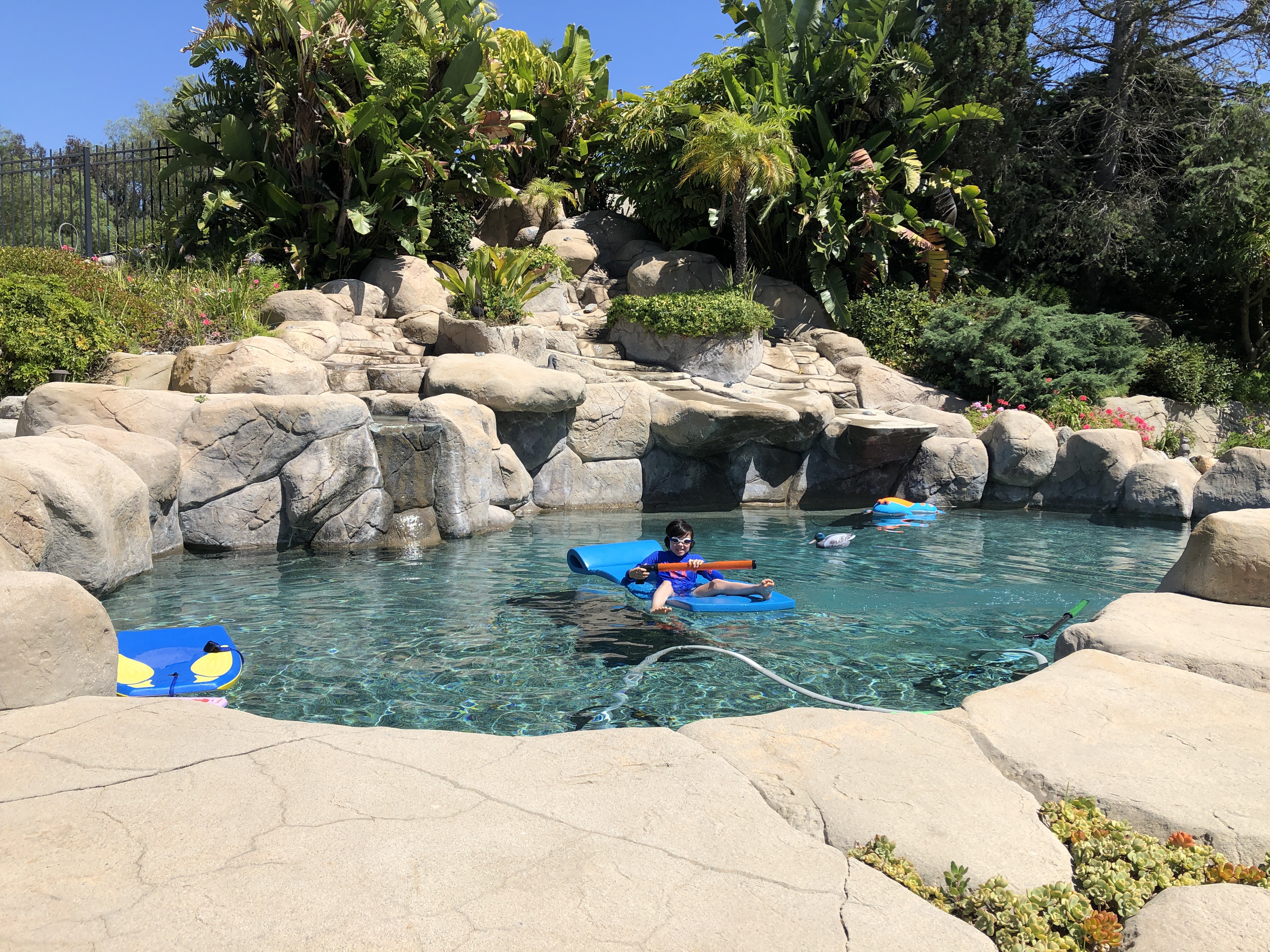 Trip to visit Popo and Gung Gung in Aug 2019. It was a nice Southern California summer week. Clear, with temps mostly around 80F (reached a max of 90F only on 1 day). We had considered going to the beach, but an offshore storm was causing high surf and rip tide warnings. Even more excuse to play on the waterfall and swim in the pool!