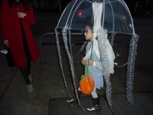 Nikola’s jellyfish: 1x clear umbrella. 8x strips of bubble wrap, partially popped. 32x blue glow sticks ($12/100-ct on Amazon!). 2x blue optic fiber glowing hair clips. 1x white leotard. 1 pair silvery boots. Alton’s costume: 1x Clone trooper. Alterations to the waist, legs. At the Arc School Halloween Bash, Nikola’s jellyfish won first prize in …